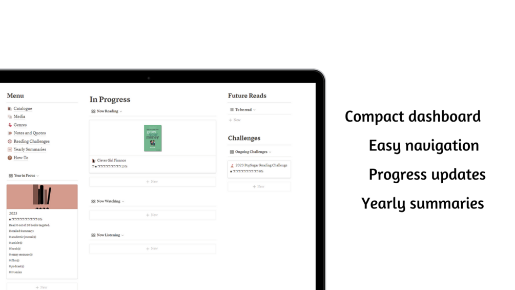 • Compact dashboard with views showing items in progress, future reads, challenges and a summary of the current year.